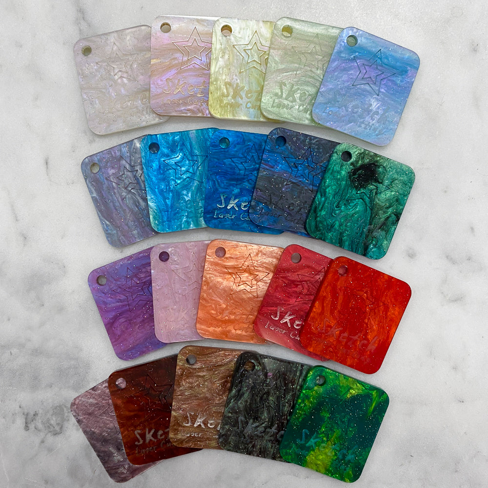 3mm sheet of cast acrylic with a rippling marble effect sprinkled with fine shimmering glitter, reminiscent of swirling galaxies or mother of pearl shells.