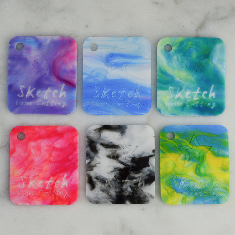 Fantasia colourful marbled acrylic is a really fun material with a colourful swirling pattern that will add joyful visuals to your project. This material is created by hand mixing purple, blue, pink and white liquid acrylic for a dynamic marble pattern, with a smooth surface.