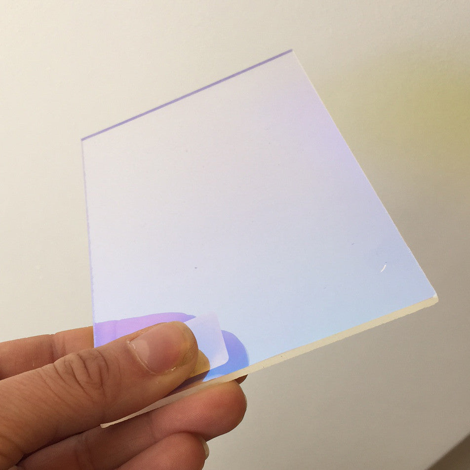 La lámina acrílica con reflejos radiantes brilla mágicamente con un espectro de colores iridiscentes que cambia de rosa a naranja, amarillo, verde, azul y morado según el ángulo de visión, sin el uso de ninguna iluminación especial. La hoja es transparente con una capa reflectante espejada en un lado.