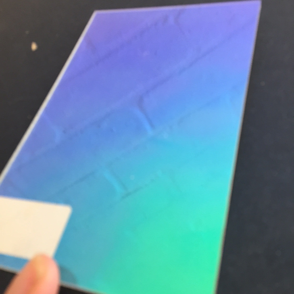Hoja acrílica extruida transparente de 3 mm de espesor con Película PET dicroica iridiscente.