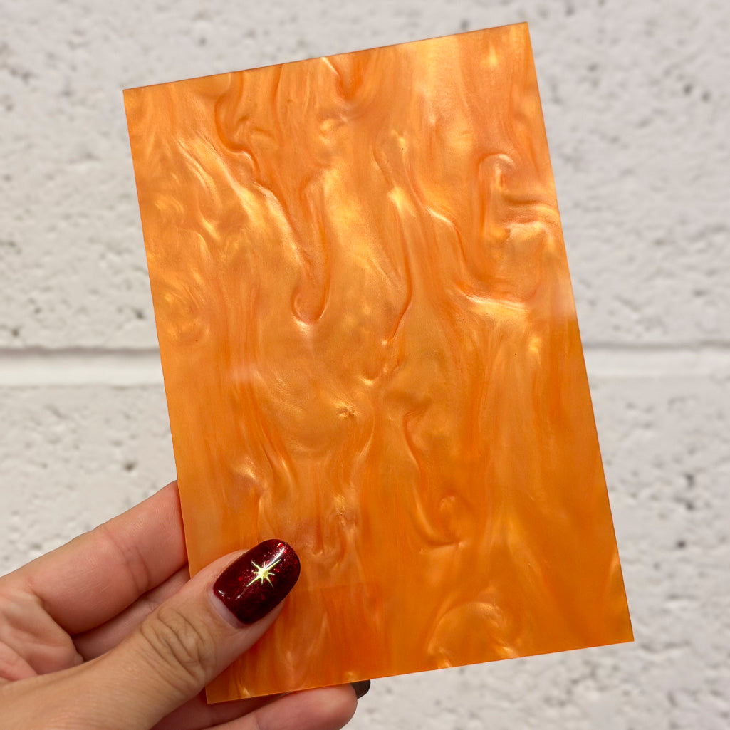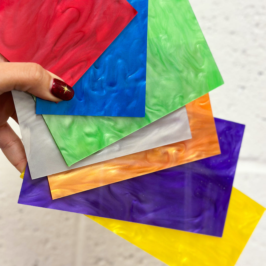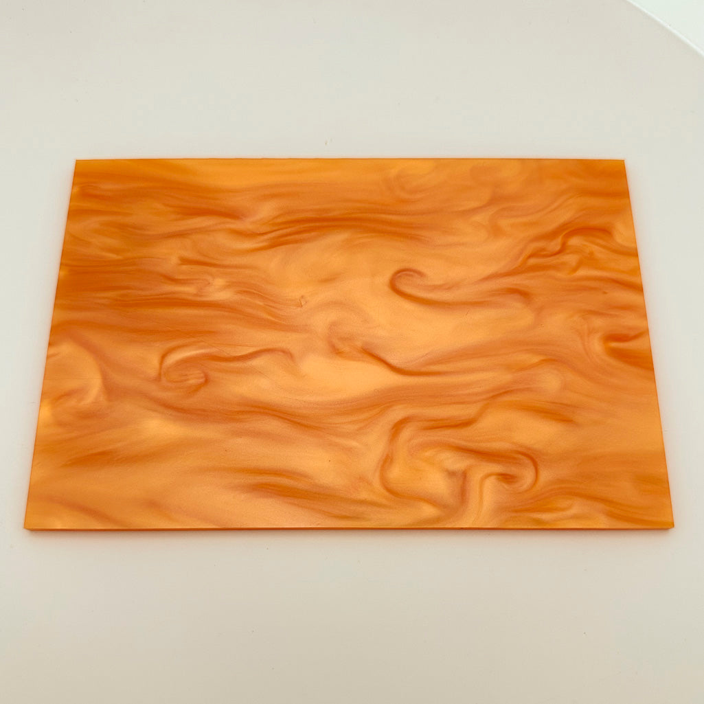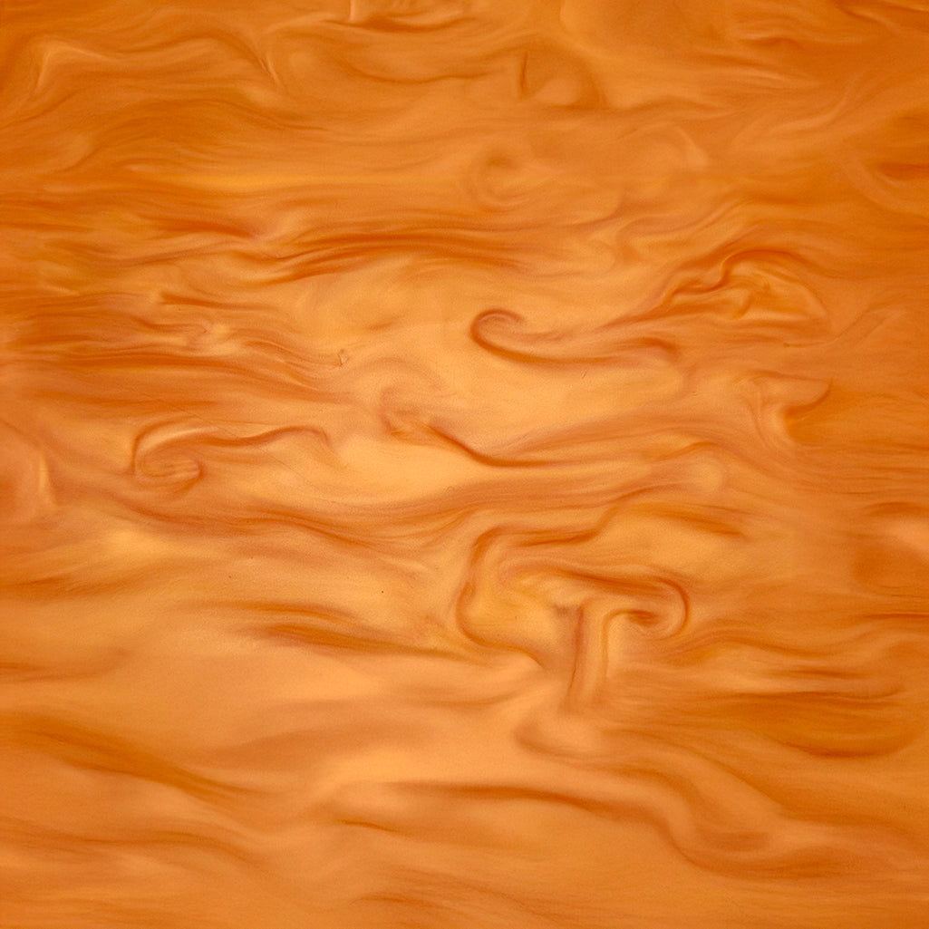 Lámina acrílica fundida en color blanco que tiene una textura nacarada jaspeada y un brillo brillante.