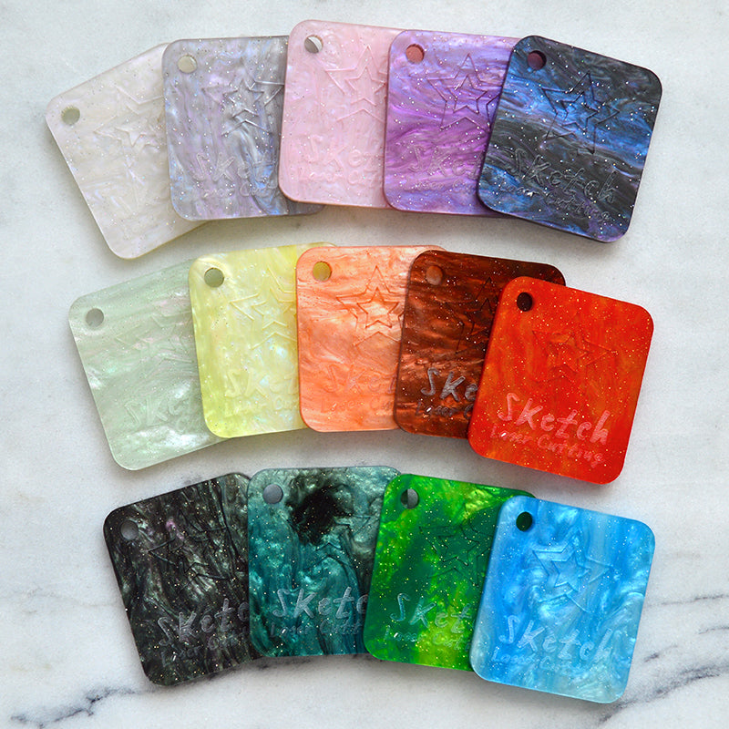 Les paillettes se trouvent sur la face recto uniquement, l'envers de cette matière est également marbré, avec un motif plus subtil.Toutes les tailles sont nominales/env. Pour acheter des tailles de feuilles non répertoriées ou des produits épuisés, veuillez nous envoyer un e-mail à info@sketchlasercutting.co.uk, ou contactez-nous via le lien ci-dessous pour passer votre commande.