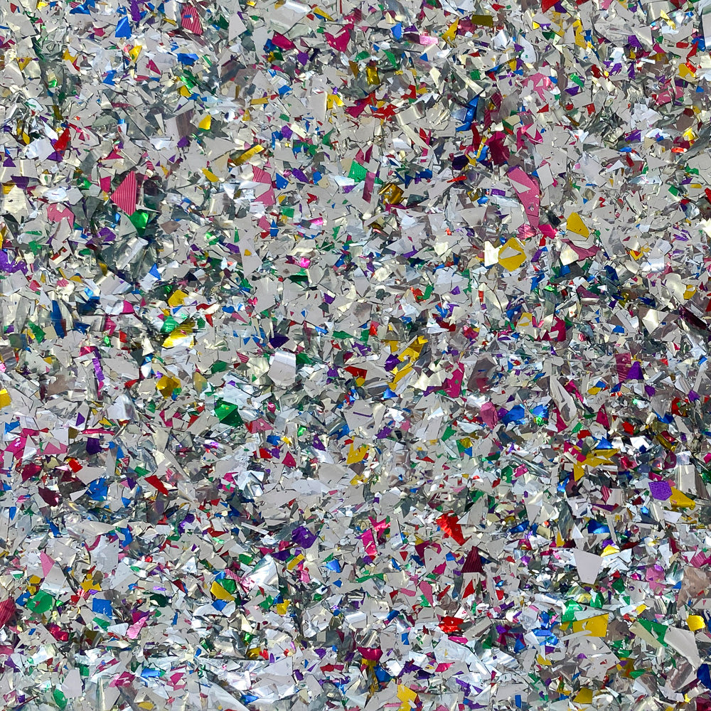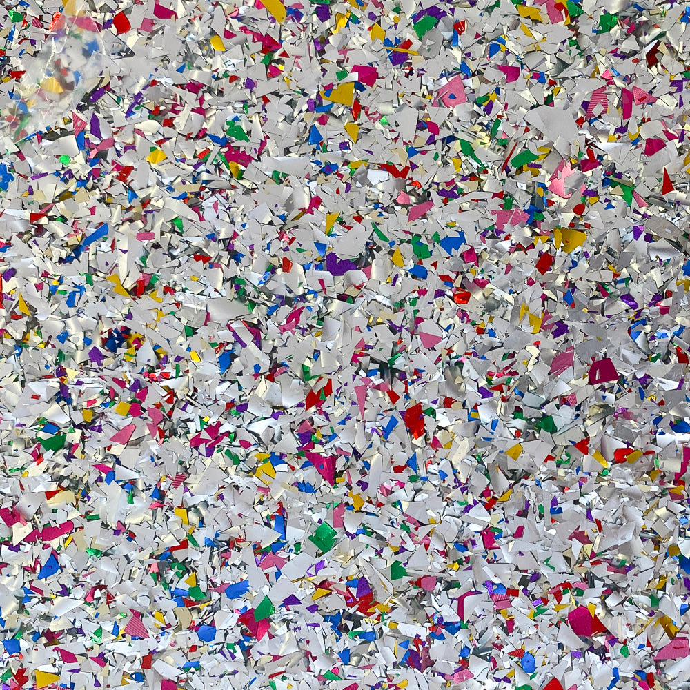 JAM PACKED en acrylique brillant de 4 mm d’épaisseur avec des éclats de confettis multicolores.