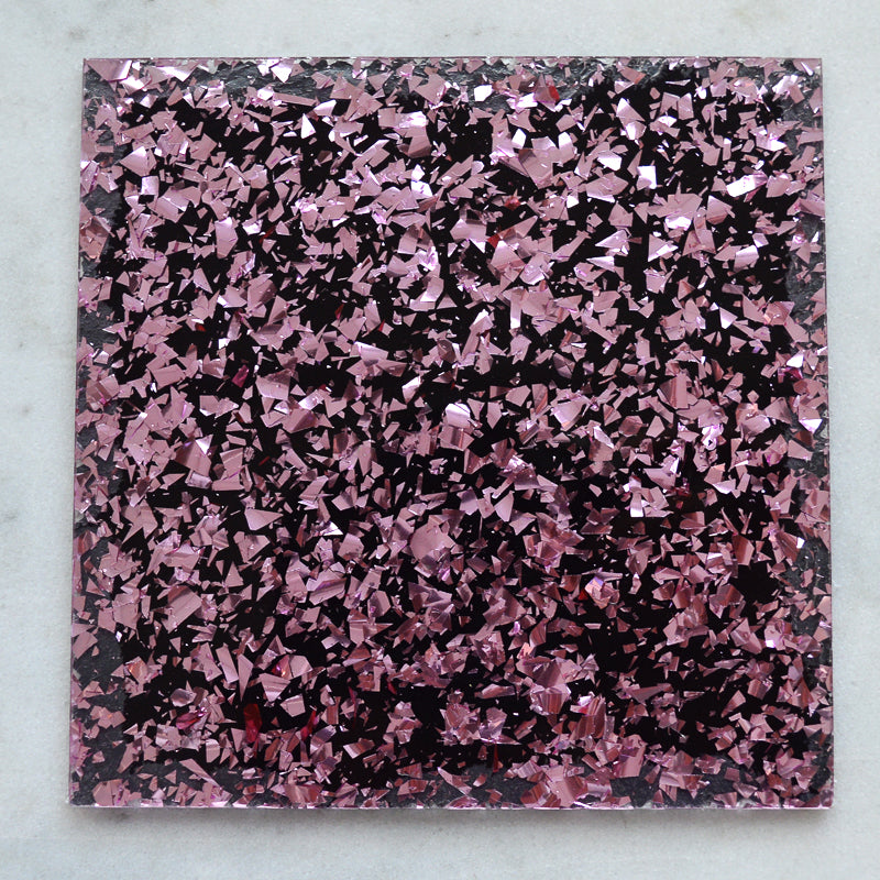 3mm thick transparent glossy acrylic with shards of chunky confetti glitter with a black background for great contrast and sparkle.