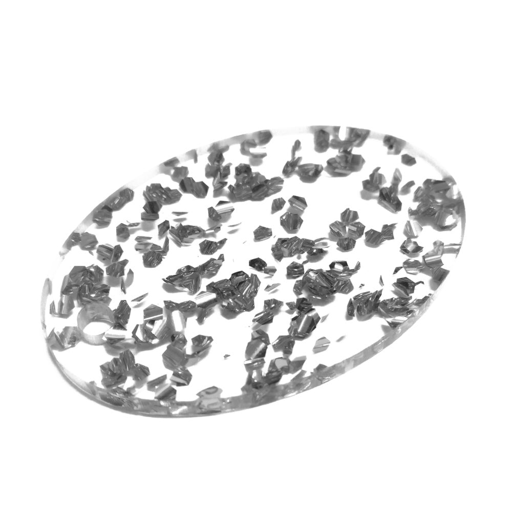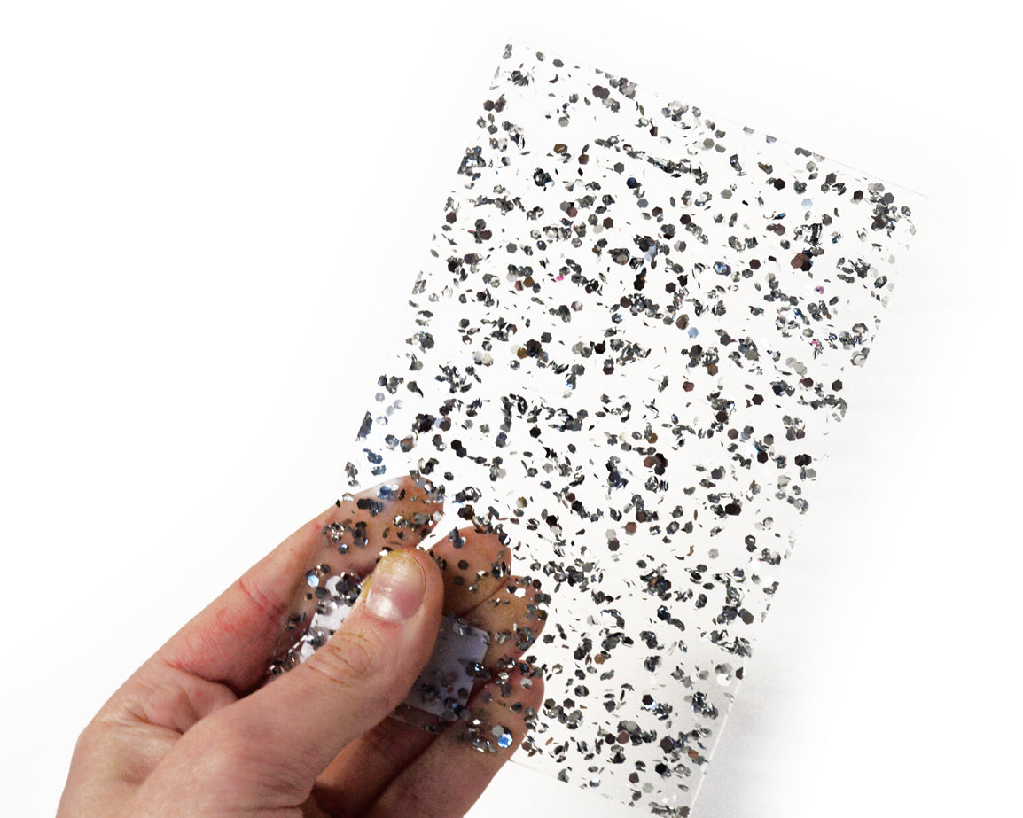 This material replaces our discontinued silver leaf acrylic. Sparkly flecks of silver foil confetti suspended in crystal clear gloss acrylic.